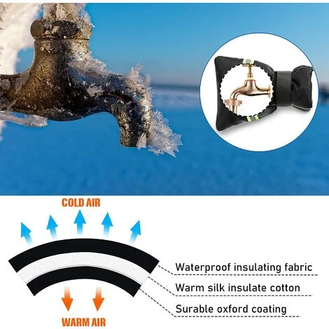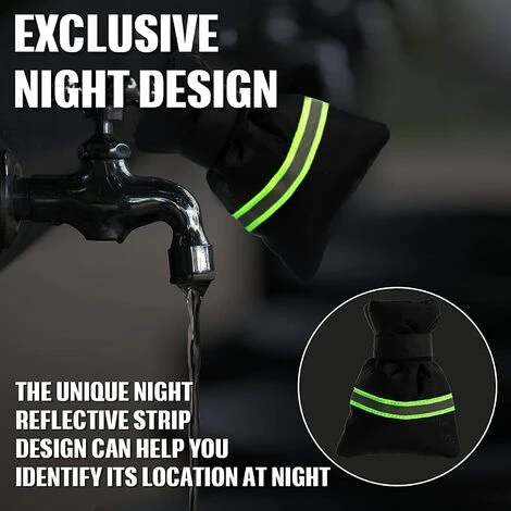 Réapplication à l’hiver ou aux jours de pluie: le protecteur isolé de la veste de protection du robinet peut être réappliqué l’hiver suivant ou les jours de pluie, de sorte qu’il peut vous servir longtemps sans changement fréquent, économisant du temps et de l’argent