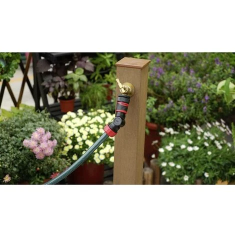Pièce angulaire pivotante et inclinable pour le robinet, afin que le tuyau de jardin ne puisse pas se casser ou se tordre sur le robinet. Convient également pour une utilisation sur un chariot-dévidoir et d’autres appareils.