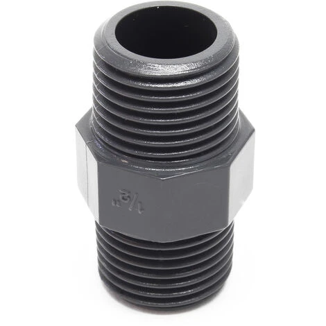 Double mamelon de rĂ©duction avec filetage extĂ©rieur de 2 x 20,67 mm (1/2″) pour relier des conduites avec un filetage intĂ©rieur de 2 x 20,67 mm (1/2″).