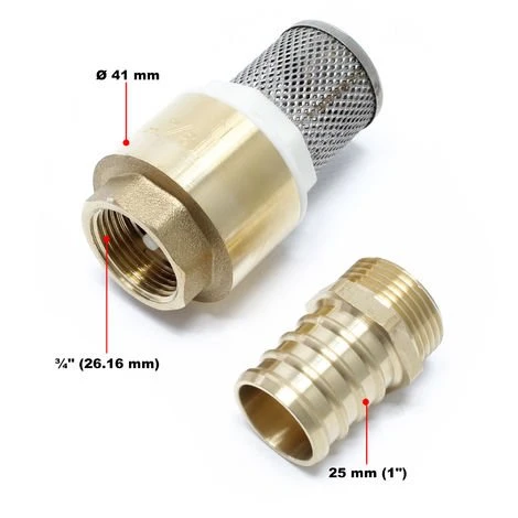 Vous recevrez un clapet de pied avec crépine d’aspiration en acier inox et clapet anti-retour en laiton.